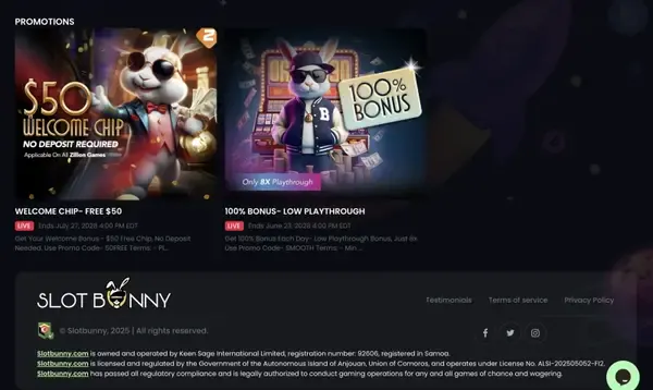 Wir sind 2025 unter Keen Sage International Ltd gestartet und arbeiten mit einer Anjouan-Glücksspiellizenz (ALSI-202505052-FI2). Wir schützen den Datenverkehr mit Erweiterter SSL-Verschlüsselung und nutzen von Dritten zertifizierte RNG-Software für faire Ergebnisse bei RNG-Spielen. Im Casino SlotBunny Deutschland setzen wir außerdem die verpflichtende monatliche Einzahlungslimitierung von €1.000 gemäß GGL-Vorgaben für deutsche Spieler um.